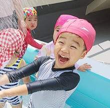 専門のコーチの元、水慣れから泳ぎを目標に取り組みます。また、着替えや脱いだ服の整理等の身支度を一人でできるようになる事も大切な内容の一つとなっています。(こども園年中・年長児対象)