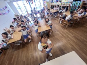 みんなで乾杯をして、給食とケーキを食べたらカード探しスタート‼️