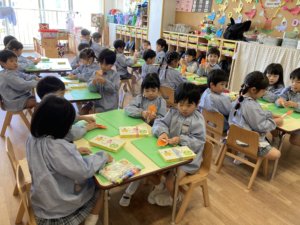 クラスのお友達と一緒に食べる給食はとっても美味しいね😋💗
