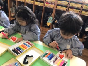 お絵描き遊びでは「みて〜ハートいっぱいかいた!」「せんせいかいたで〜!」「これは恐竜のあしやねん!」とニコニコで自由画帳を見せてくれましたよ☺️❤️