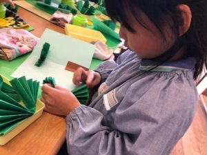 次は台紙に蛇腹折りにしたツリー、木、星⭐️を貼っていきます♪