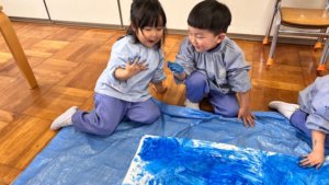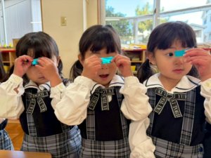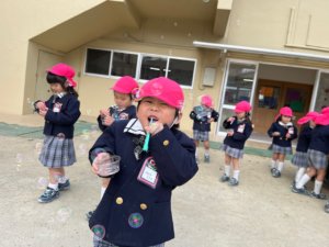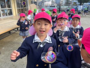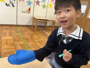 手袋にしゃぼん玉を乗せてお遊びしている中で、より長く手袋に乗せるにはどうすれば良いかと子どもたちと話していたところ…