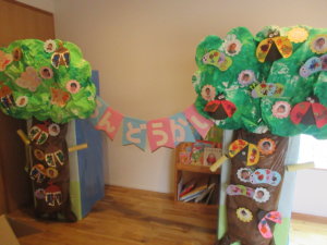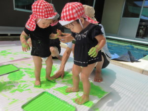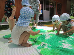 今回の運動会のテーマは『ムシ🐞』でした!入場門には一人ひとり作った虫さんの製作を貼ったり、虫がいる木を作るためにボディペインティングで緑色に塗ったりしました🎵