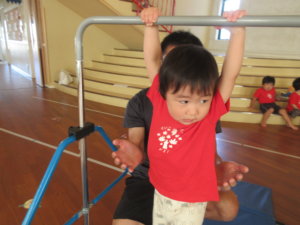 鉄棒では自分の体重を腕で支えてぶら下がる姿や、小さなお子さんは先生に支えてもらいながら棒をぎゅっと握れるようになった姿を見てもらいました!