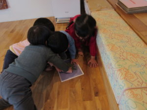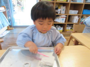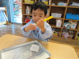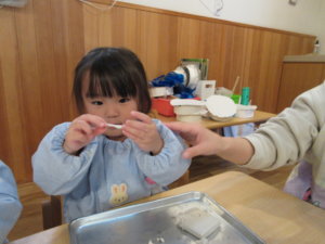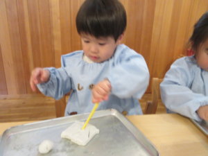 先生と丸を作って雪だるまを作ったり、小さなかわいい手のひらで粘土をころころ熱心に転がし「できたー!」と細長くなった粘土を見せてくれる子等々。