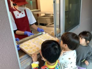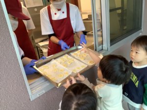 生地を焼いてもらうために給食室に持って行き「おねがいします!」と上手に言って渡しました💕
