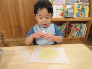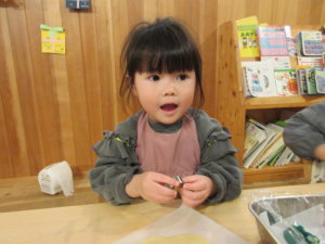 ふたばさんは「生地がやわらかいね」と指で押したり、丸めたりと感触を楽しんでいました😊